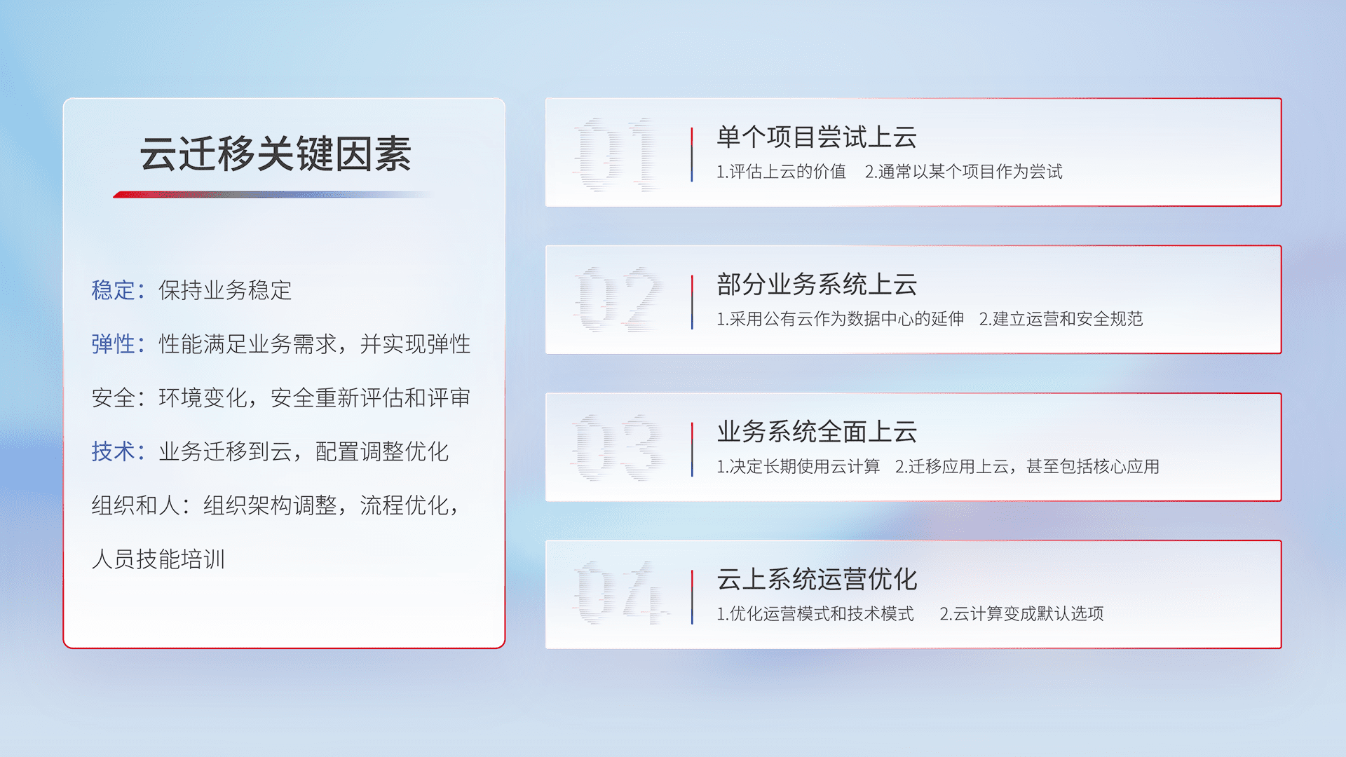 结合实际业务,,从规划设计、、、、云平台选型、、云原生改造、、、、数据迁移、、集成交付,,迁移全过程为客户识别最佳上云路径,,,做好风险识别管理,,设计网络架构、、身份权限、、安全审计合规、、操作审计、、、日志审计、、、、监控告警策略、、、多站点容灾设计等,,,,对云上基础设施进行整体规划,,提升IT治理水平,,,以满足弹性、、、、高可用、、、、高性能的需求。。。